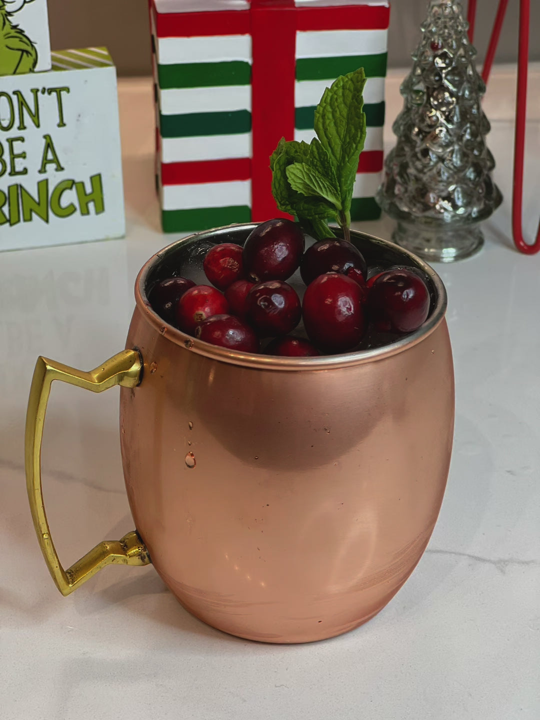 2 oz Vodka, 1 oz Cranberry Juice, 1/2 oz Lime Juice, Ginger Beer to top, Fresh cranberries for garnish!